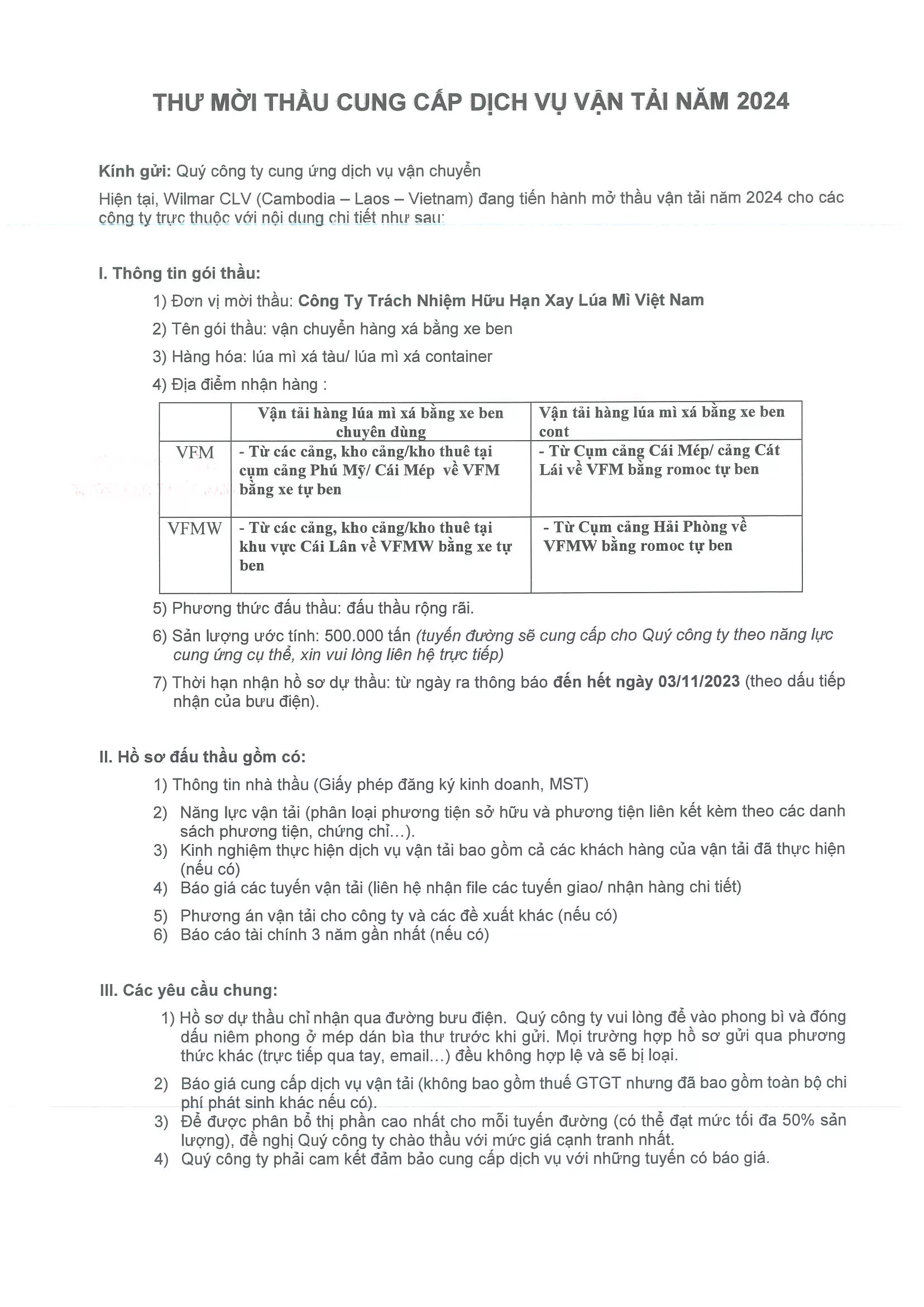 Hiện tại, Wilmar CLV (Cambodia – Laos – Vietnam) đang tiến hành mở thầu vận tải năm 2024 cho các công ty trực thuộc với nội dung chi tiết như sau: