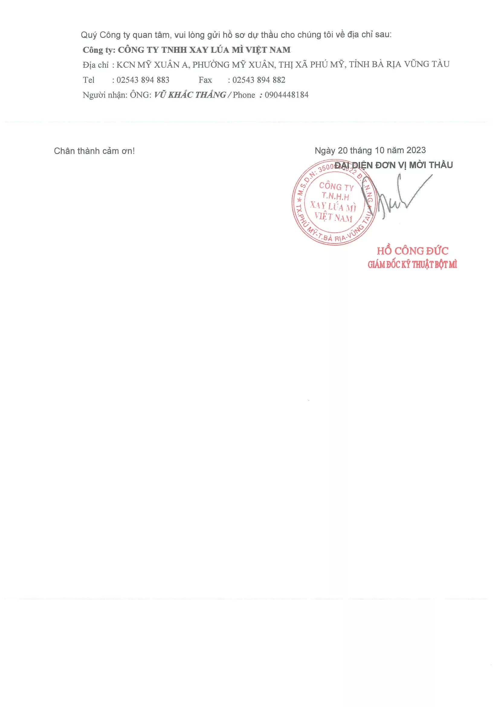 1) Đơn vị mời thầu: CôngTy TNHH Xay Lúa Mì Việt Nam