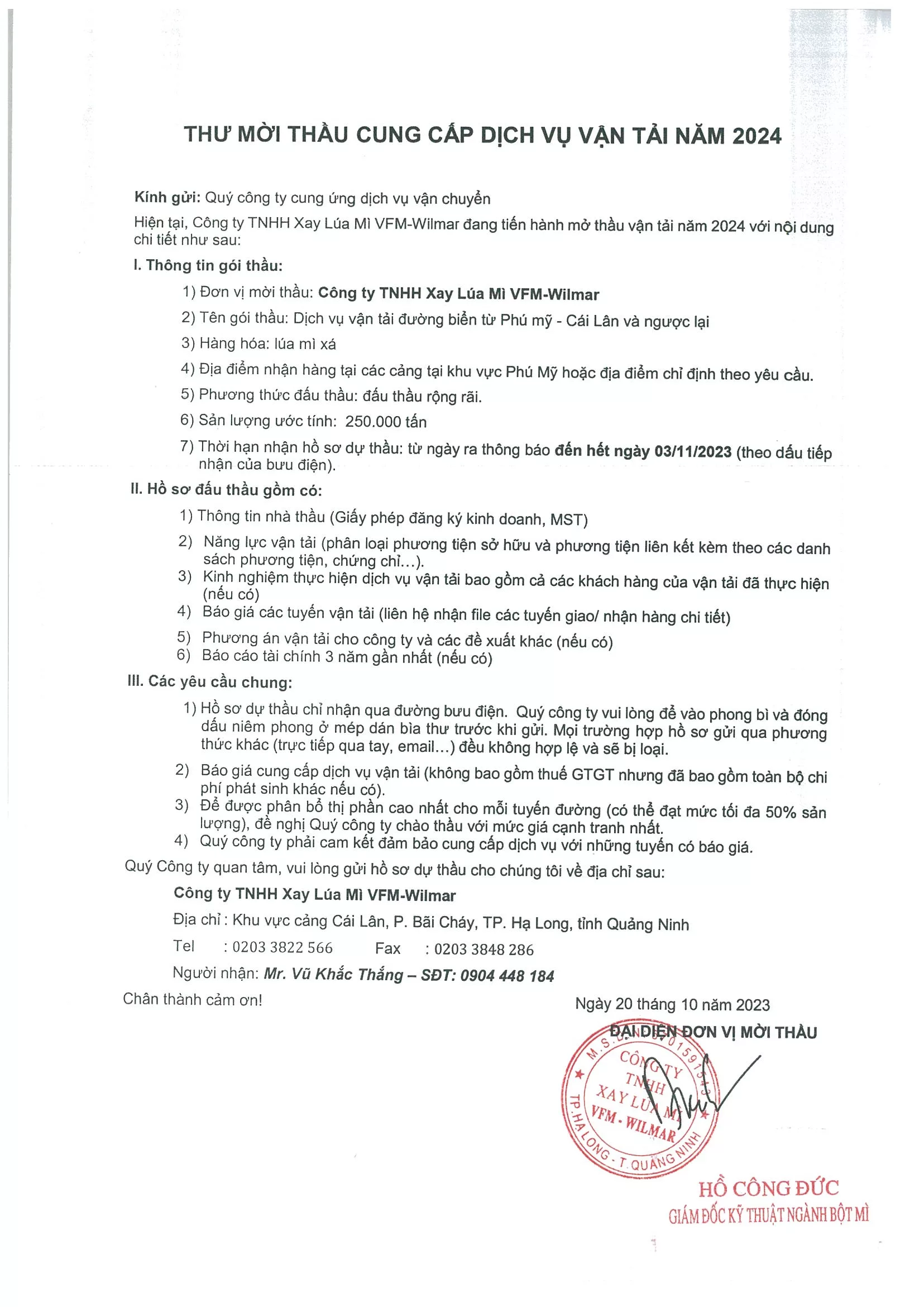 Hiện tại, Công ty TNHH Xay Lúa Mì VFM-Wilmar đang tiến hành mở thầu vận tải năm 2024 với nội dung chi tiết như sau: